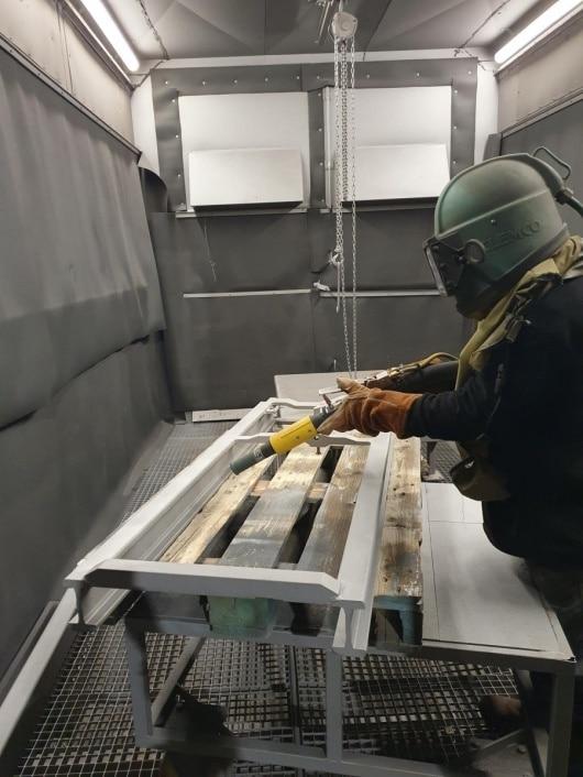 - Le grenaillage : projection de grenaille d’acier (sorte de petit caillou prismatique en acier) sur les surfaces à traiter pour nettoyer et préparer la surface à recevoir la couche de zinc.